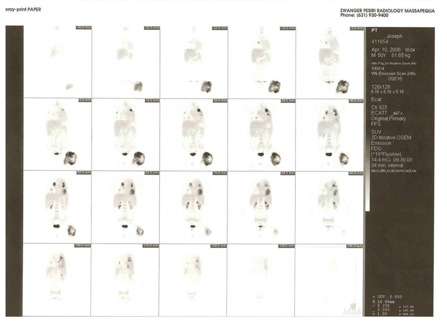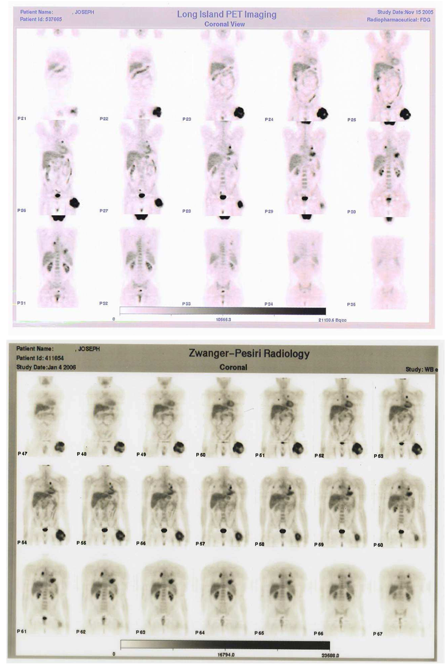I am including PET scans - Nov 15 2005, Jan 4 2006 and April 10 2006. to show 90 - 95% necrotic dead cancer tissue, especially in hip. And the lower lung lobes are extremely small compared to Nov & Jan.
