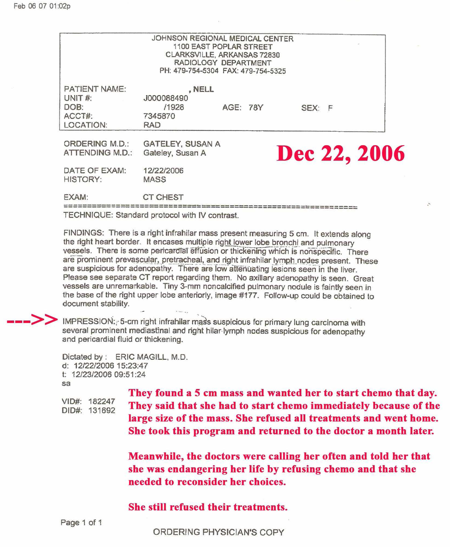 Nell, 78 years old at that time, was diagnosed with 5 cm lung cancer on December 22, 2006. The doctors told her that she had no choice but to take chemo to add time to her life, she was given a short time to live. She refused and did not want their treatments. She started with 4 doses daily, sometimes 8 when she could. When she returned the next month, she felt fine, the tests could not show any mass. The doctors were confused and told her that they never saw anything like this happen before. They added that they never saw lung cancer improve, therefore, they can only believe that they must have incorrectly diagnosed her in December and that instead of lung cancer, and that the biopsy had to have been incorrect because it resolved itself and went away, it therefore must have been pneumonia. Although they never saw pneumonia do that, they can only draw that conclusion because they have no other explanation.
