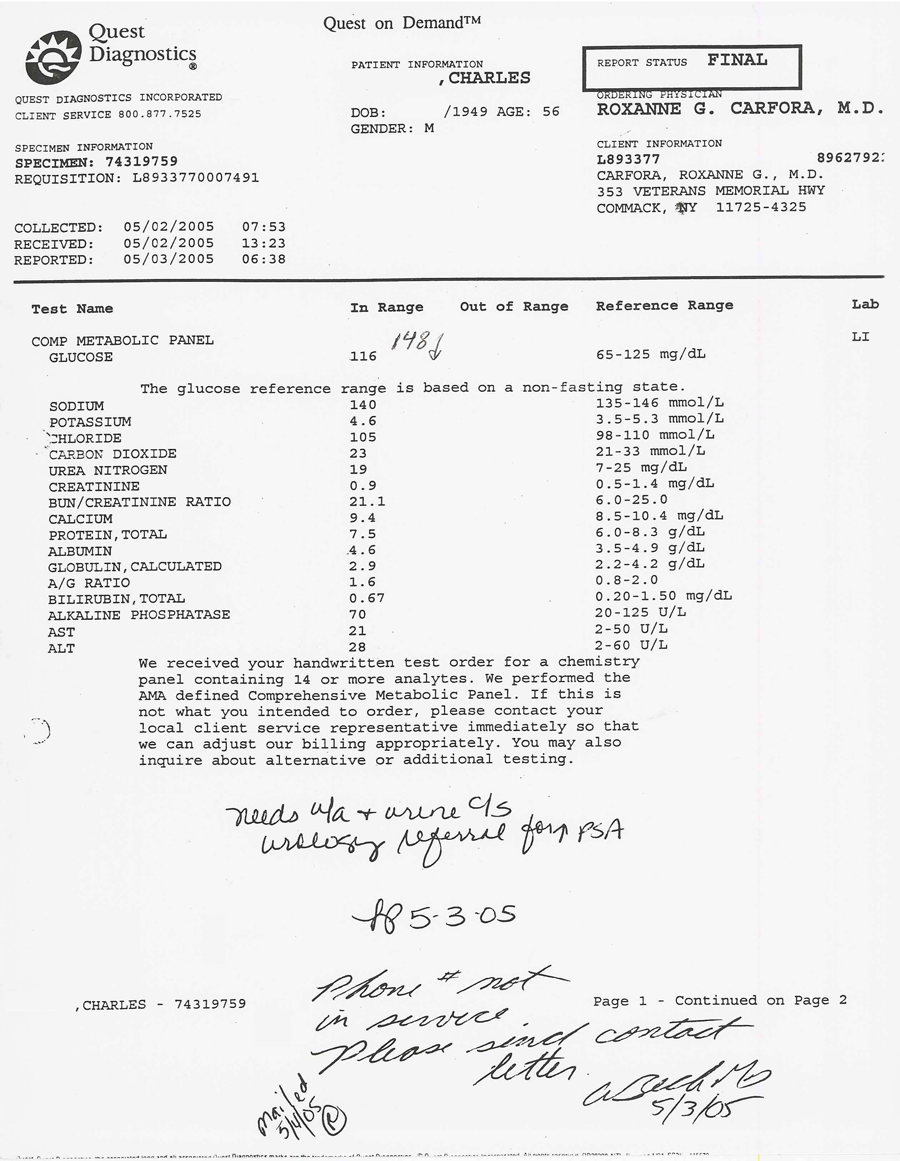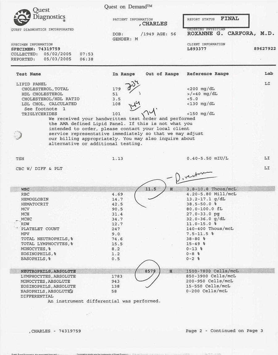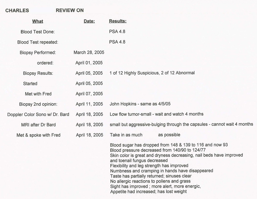 Charlie's wife Julie charted his progress. His doctor was concerned about the 5/2/05 chart showing that he stopped all his meds, she ordered bloodwork. Results shown in "Lab 1" and "Lab 2" show dramatic reduction showing normal results after he weaned off the medications.
