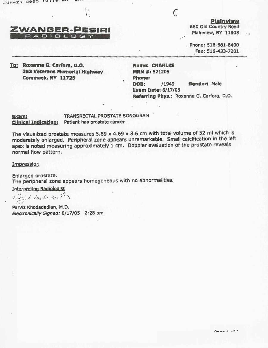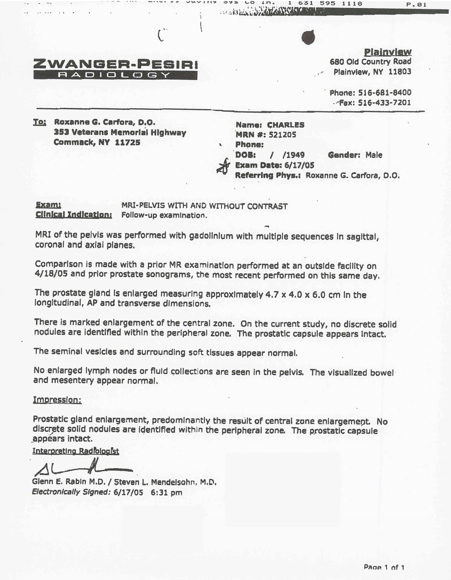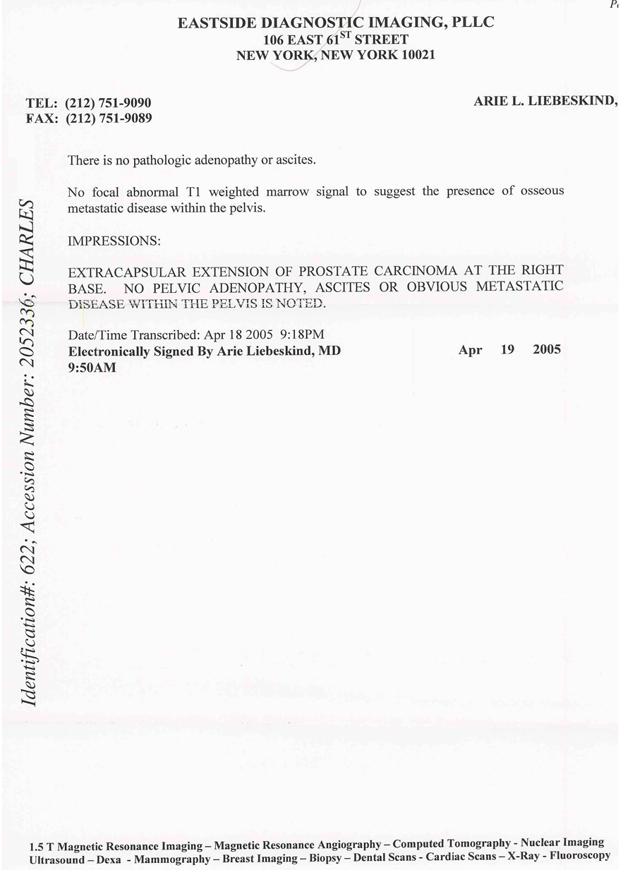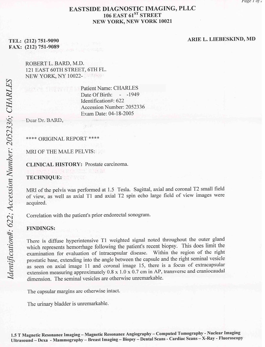 Charlie, 56, was diagnosed early April 2005 with advanced prostate cancer extending past the capsule. The only option given him was lupron and to consider a prostatectomy to prevent further spread. I did not agree with the options at all. See report in first two attachments.